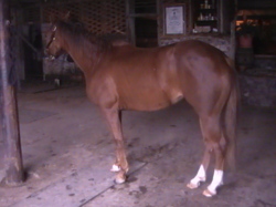 "San" is '94 chestnut mare. She has had over 1 year of cutting training. She is very cowy and is one of those mares that is SAFE! SAFE! SAFE! She is about 14.3. San had Doc Bar on her papers, as well as many other point and money producing horses. Click on the link below to view San's pedigree.